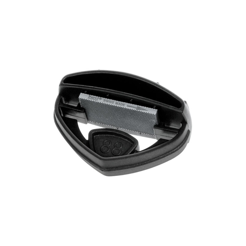 Angulador con 2 grados fijos (89º, 88º). Adaptable para usar con ambas manos. Tamaño bolsillo. Compatible con limas de hasta 6 mm de ancho y 40 mm de largo. Incluye lima de 40 cm y diamante.