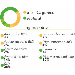 Harina de soja 20%, jarabe de arroz, copos de avena sin gluten, mijo y arroz crujiente (mijo, maíz, arroz, azúcar de caña), anacardos 8%, granos de soja 7.6%, aceite colza, azúcar de caña, pasta de caramelo 4% (azúcar, jarabe de glucosa, leche condensada, colorante: caramelo, almidón modificado) granos de cacao 2%, humectante: glicerina.