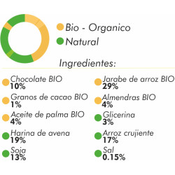 jarabe de arroz, harina de avena 18%, arroz inflado (harina de arroz 69%, azúcar, jarabe de glucosa, cacao en polvo 4%, extracto de malta de cebada, sal) harina de soja, chocolate 9% (pasta de cacao 46%, azúcar, manteca de cacao 10%, emulsionante: lecitina de soja, vainilla natural, cacao: minimo 50%), grasa vegetal (palma, karité), humectante: glicerina, almendras, cacao en polvo, colorante: caramelo, aroma, sal marina.