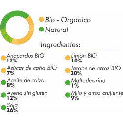 harina de soja 19%, jarabe de arroz, harina de avena sin gluten, mijo y arroz crujiente (mijo, maíz, arroz, azúcar de caña), granos de soja tostados 9%, aceite de colza, pasta de limón 7% (limón seco, azúcar de caña, zumo de limón concentrado, espesantes: pectina aroma, acidi ficante: ácido cítrico), anacardos 7%, azúcar de caña, humectante: glicerina, maltodextrina.