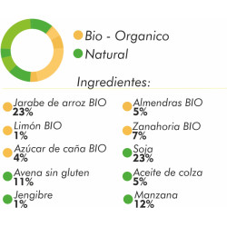 Jarabe de arroz, harina de soja, harina de avena sin gluten, mijo y arroz crujiente (mijo, maíz, arroz, azúcar de caña) granos de soja tostados, aceite de colza, manzana deshidratada 6%, zanahoria deshidratada 6%, compota de manzana 6%(manzana 46% azúcar, jarabe de glucosa, regulador de acidez: ácido málico, espesante: agar-agar, pectina, aroma natural), almendras, azúcar de caña, jengibre deshidratado, humectante: glicerina, limón en polvo (zumo de limón concentrado, maltodextrina).