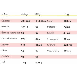 Maltodextrosa, glucosa, isomaltulosa 20% (fuente de glucosa y fructosa), sacarosa, regulador ácido: ácido crítico, calcio láctico, citrato de sodio, cloruro de sodio, citrato de magnesio, aroma, ácido L-ascorbico, citrato de potasio, potasio de dihidrogenofosfato, cloruro de fosfato.