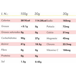 Maltodextrosa, glucosa, isomaltulosa 20% (fuente de glucosa y fructosa), sacarosa, regulador acido: ácido crítico, calcio láctico, aroma, colorante natural: remolacha, citrato de sodio, cloruro de sodio, citrato de magnesio, ácido L-ascorbico, citrato de potasio, potasio de hidrogenofosfato, cloruro de potasio.