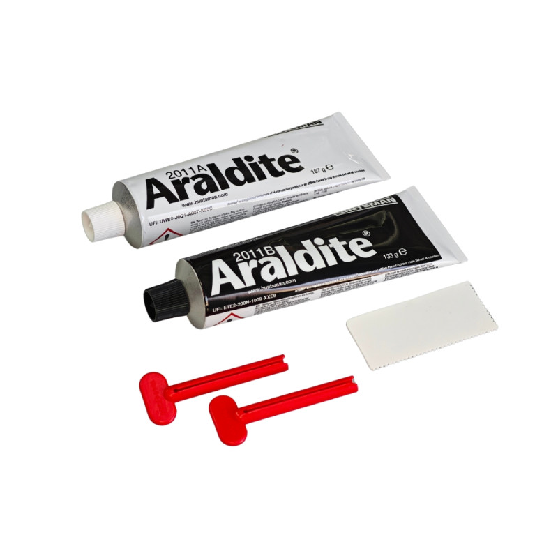 Araldite 2011 es un adhesivo epoxi bicomponente, multiusos, de curado a temperatura ambiente de alta resistencia y tenacidad. Es adecuado para la unión de una amplia variedad de materiales, incluidos plásticos, metales, cerámicas, vidrio, caucho ... Esta versatilidad lo hacen adecuado para la reparación o sustitución de suelas de esquí.