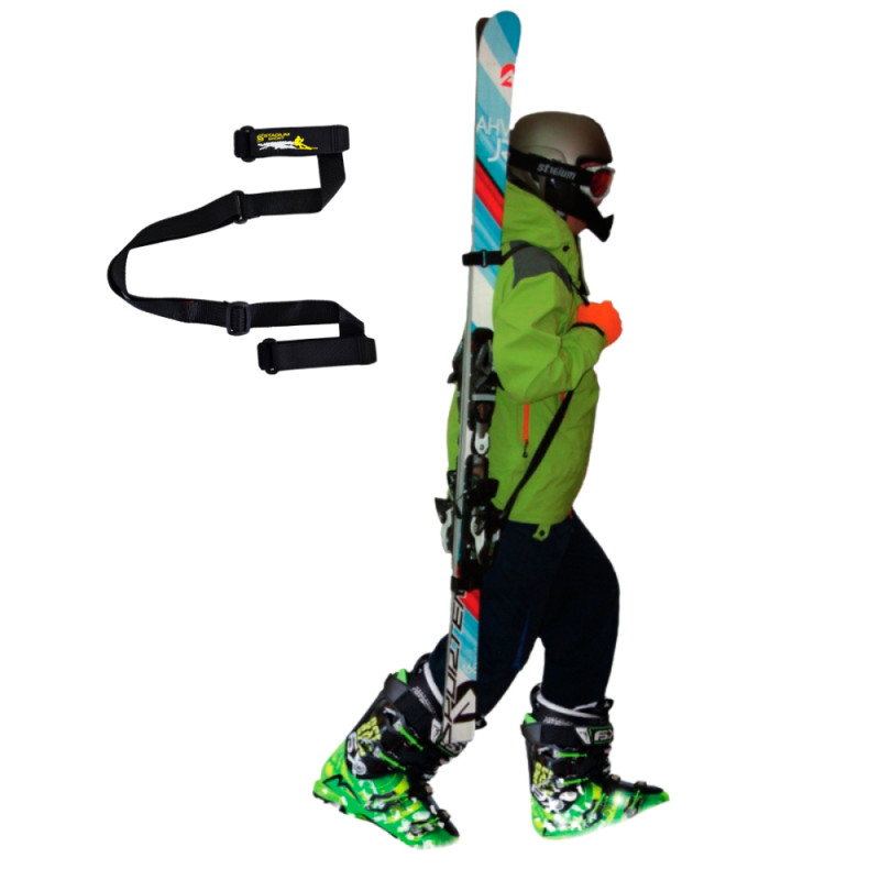 Bandolera Portaesquís regulable en altura, compuesta por dos cintas agarra esquíes con velcro de alta resistencia y fácil colocación. Gracias a su correa facilita el transporte de los esquís en la espalda.