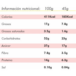 Todos los ingredientes son NATURALES y BIO, sin azucares añadidos, SIN OMG (sin organismos modificados genéticamente).
