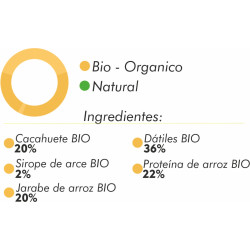 Dátiles, proteína de arroz, jarabe de arroz, cacahuetes 12%, pasta de cacahuetes cruda, sirpoe de arce.