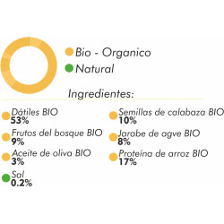 Todos los ingredientes son NATURALES y BIO, sin azucares añadidos, SIN OMG (sin organismos modificados genéticamente).