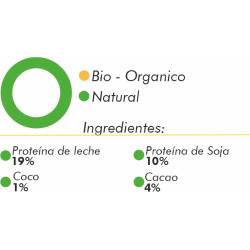 Proteína de leche, edulcorante: malitol, fructooligosacáridos, manteca de cacaco, proteína de soja, humectante: glicerina, leche entera en polvo, aceite de colza, cacao en polvo desgrasado, colágeno hidrolizado, coco, suero de leche en polvo, almidón de tapioca, emulgente: lecitinas, aromas, cacahuetes y avellanas.