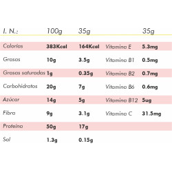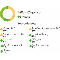 Aislado de soja, concentrado de proteína de calabaza, cacao en polvo 10%, sacarosa, glucosa, fructooligosacárido (FOS), emulsionante: lecitina de soja, jarabe de arce 1%, premezcla de vitaminas (ácido L-ascórbico, acetato de DL-alfa-tocoferilo, riboflavinamida, clorhidrato de D-piridoxina de calcio, mononitrato de tiamina, ácido fólico, D-biotina, cianocobalmina), aceite de girasol, opti-7-digest 0.1% (mezcla de enzimas vegetales amilasa, celulasa, lactasa, lipasa, proteasa, papaína, bromelina), antioxidante: vitamina C a E, edulcorantes: glucósidos de dteviol, fumarato de hierro, antioxidantes: vitamina E (acetato de DL-a-tocoferilo) y vitamina C (L-ascorbilo-6-palmitato).